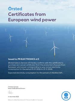 PR electronics A/S is committed to reducing our environmental impacts and as part of this commitment we have signed up for a Partnership with Orsted with the purpose of covering all electricity needs through wind power.
