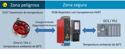 - Transmisor en Zona 0 Ex ia clasificado / Barrera en zona segura [Ex ia] clasificado.
