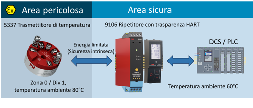 - Determinare le temperature operative del trasmettitore, ad esempio 80 °C ambiente. La temperatura di accensione dell'idrogeno di 560 °C è ben al di sopra del requisito per la classificazione di temperatura Ex T4 = 135 °C. La barriera ha una temperatura ambiente operativa fino a 60 °C nell'area sicura.