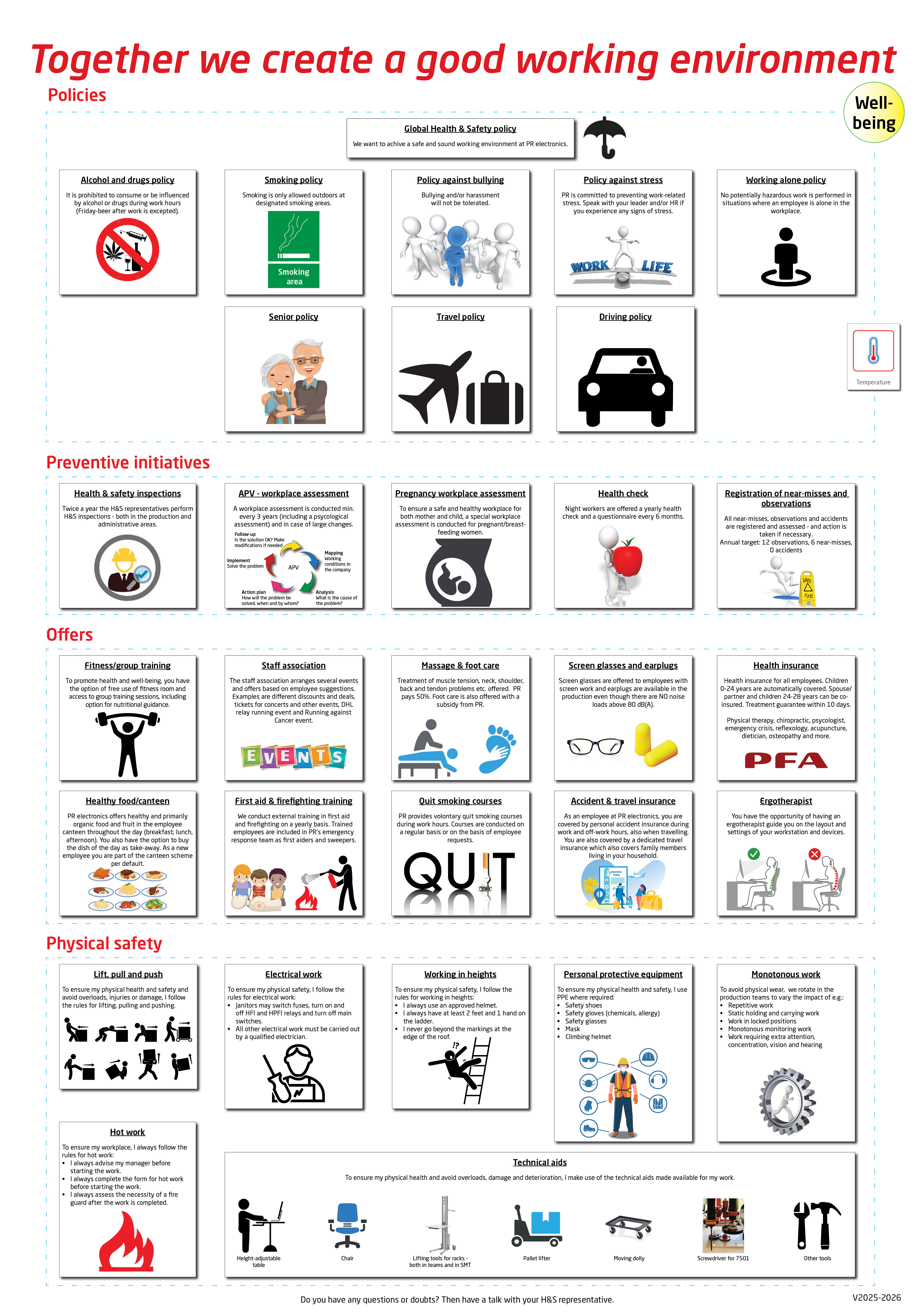 At PR electronics we have a strong focus on Health and Safety including the well-being of our employees. Our Health & Safety organization consists of both top management as well as employee representatives across the organization.